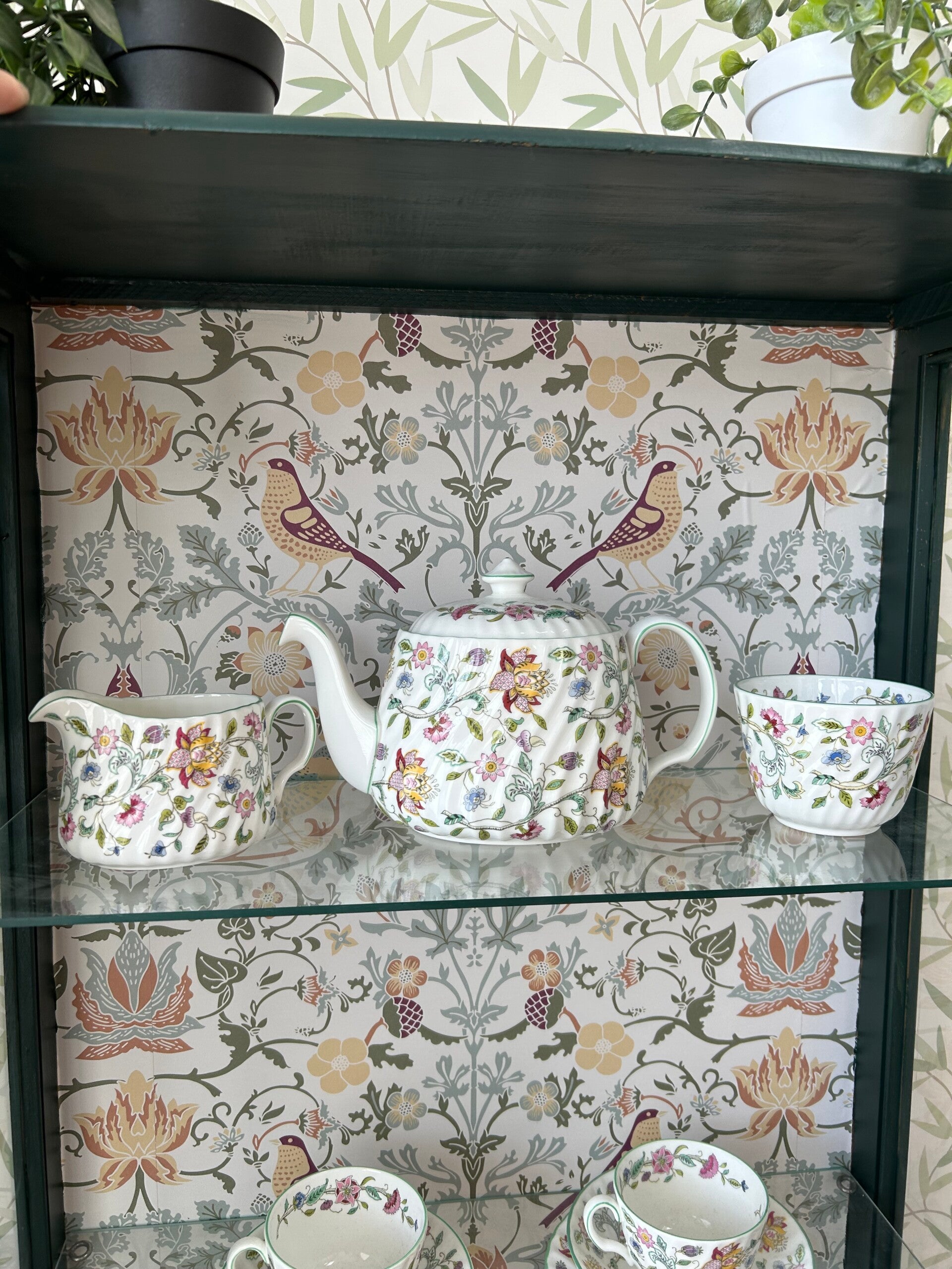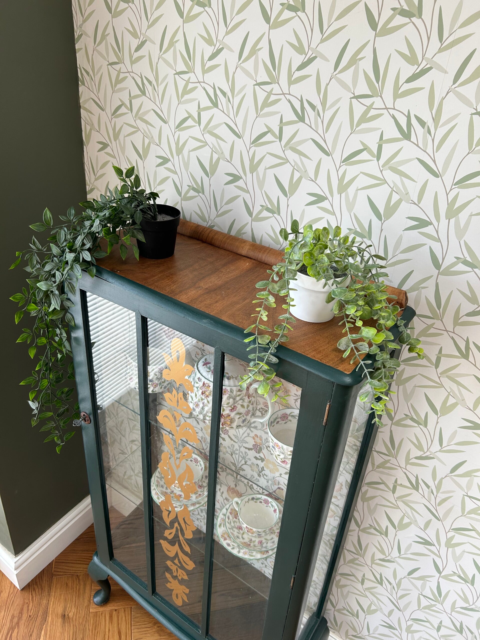 A stunning Art Deco display cabinet, lovingly up-cycled to bring character to any room. Perfect for showcasing your favourite teaset or using as a stylish drinks cabinet. Painted in Dulux Heritage – Mallard Green, with the top surface gently waxed for a soft, natural finish.